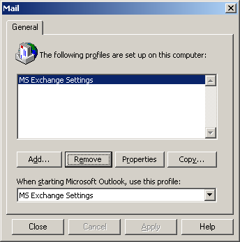 On this screen shot you can see I have a single mail profile called “MS Exchange Settings”. This is the mail profile currently being used to allow SQL Mail and SQL Agent mail to sent and receive email via Exchange. On my machine I decided I wanted to setup a new mail profile for SQL Mail and SQL Agent to use. To set up this new profile you need to click on the “Add…” button. When doing that the Microsoft Outlook Setup Wizards will be displayed.