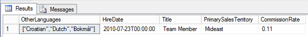declare @json nvarchar(max) SELECT @json=[CustomFields] FROM [WideWorldImporters].[Application].[People] where PersonID=8 select * from openjson(@json)
