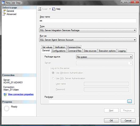 - Select SQL Server Integration Services Package as the Type, choose an account for it to run under, and select the package to run. This package can be stored in the file system or in SQL Server or in the SSIS Package store. You should end up with a dialog looking something like this: