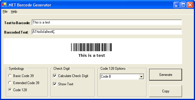 The Barcode generator only accepts standard ASCII printable characters as input. Code 128 Set A special characters and other characters are not allowed as input. To install the program, just extract and run the .EXE file. To use the program, enter the text you wish to barcode, select a symbology (Code 39, Ext. Code 39 or Code 128), and press Generate. Once your barcode is displayed onscreen you can copy it to the clipboard by pressing Copy. You can also copy the encoded text from the Barcoded Text box and paste it into a Word document. You can then use the True Type fonts to display them as barcodes. Additionally you can save the barcode image as a bitmap file by selecting File > Save As File from the main menu.