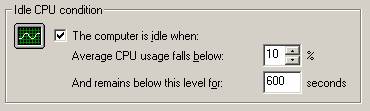 Specify the idle CPU condition by percentage. Idle is when the average CPU usage remains below the selected percent for the specified number of seconds.