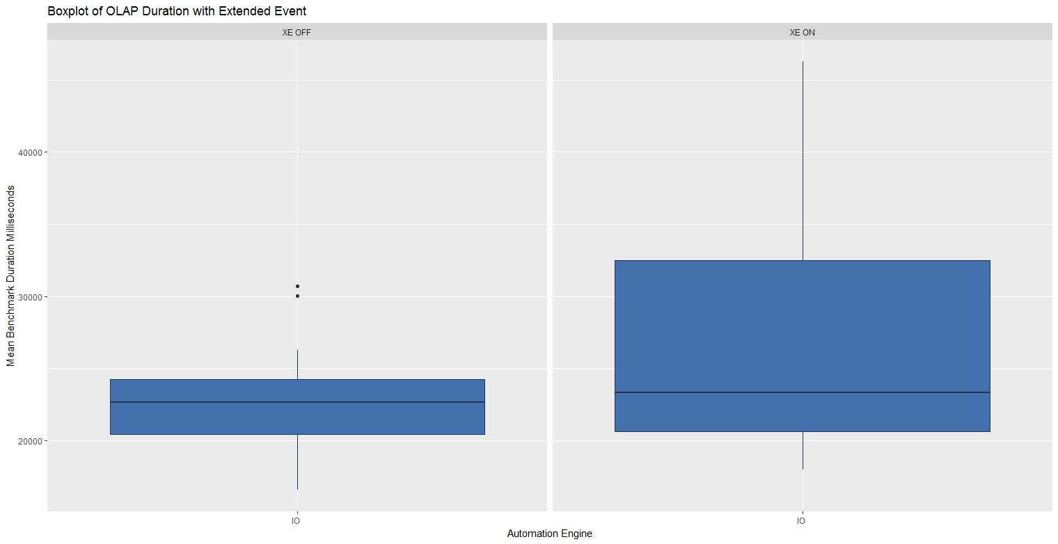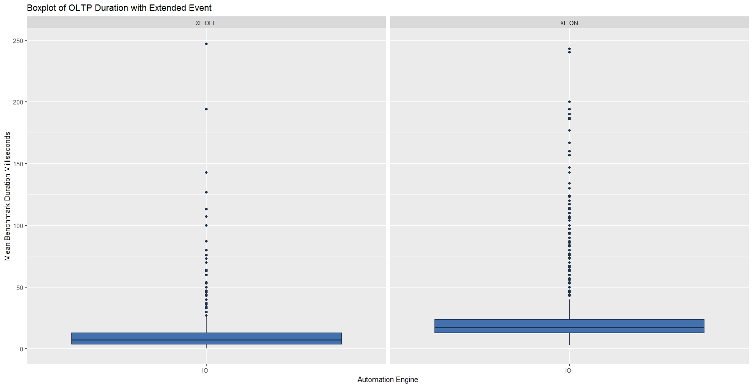 When processing 10 larger expensive batches with the XE Session running, there was far greater variability in the benchmark times.