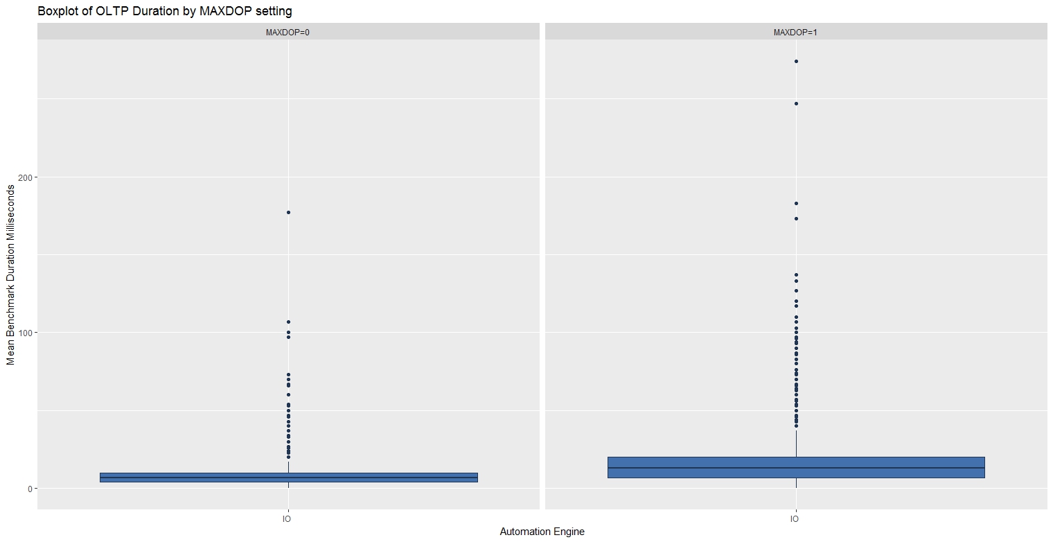p1 <- p1 + ggtitle("Boxplot of OLTP Duration by MAXDOP setting")