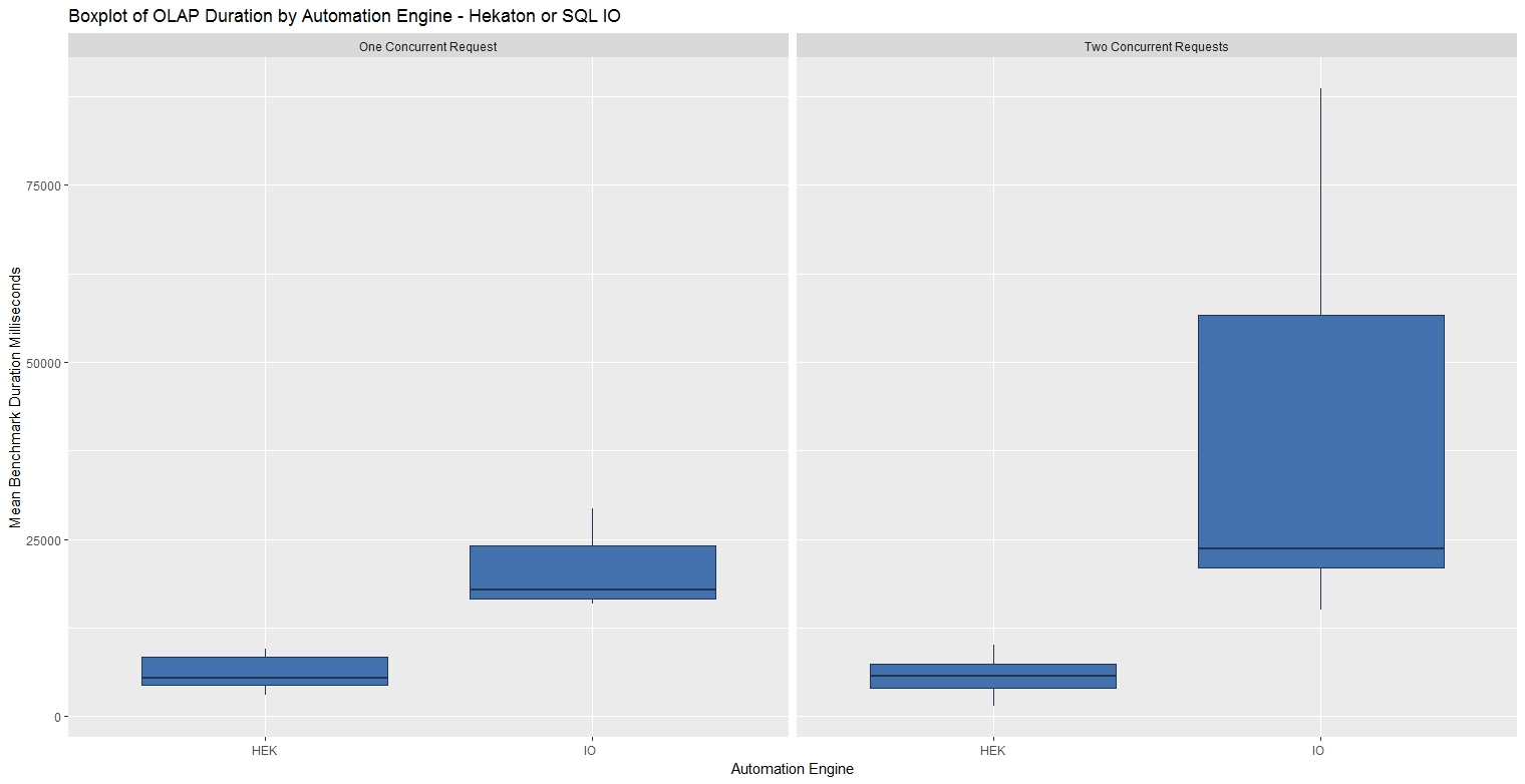 p1 <- p1 + ggtitle("Boxplot of OLAP Duration by Automation Engine - Hekaton or SQL IO")