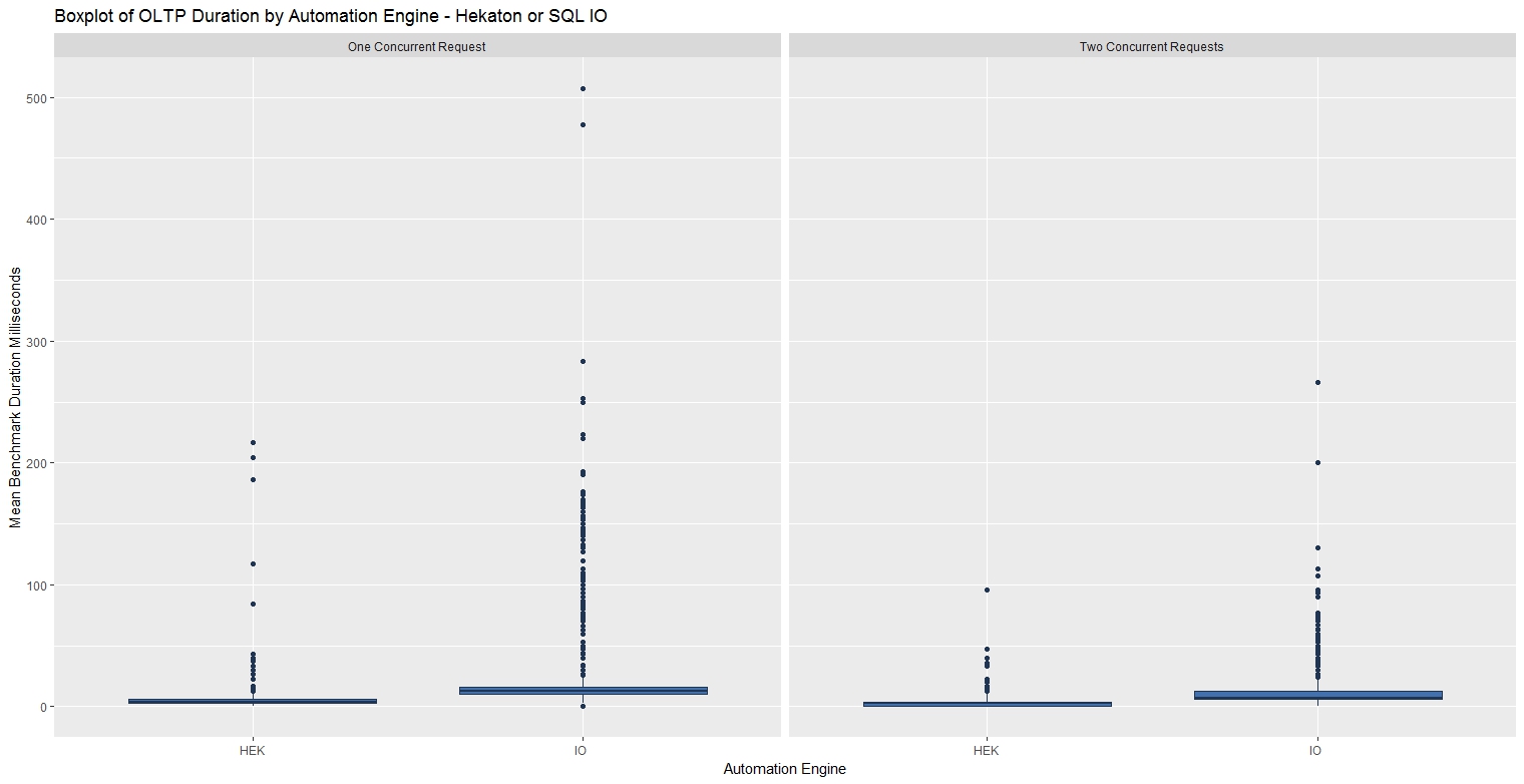 p1 <- p1 + ggtitle("Boxplot of OLTP Duration by Automation Engine - Hekaton or SQL IO")