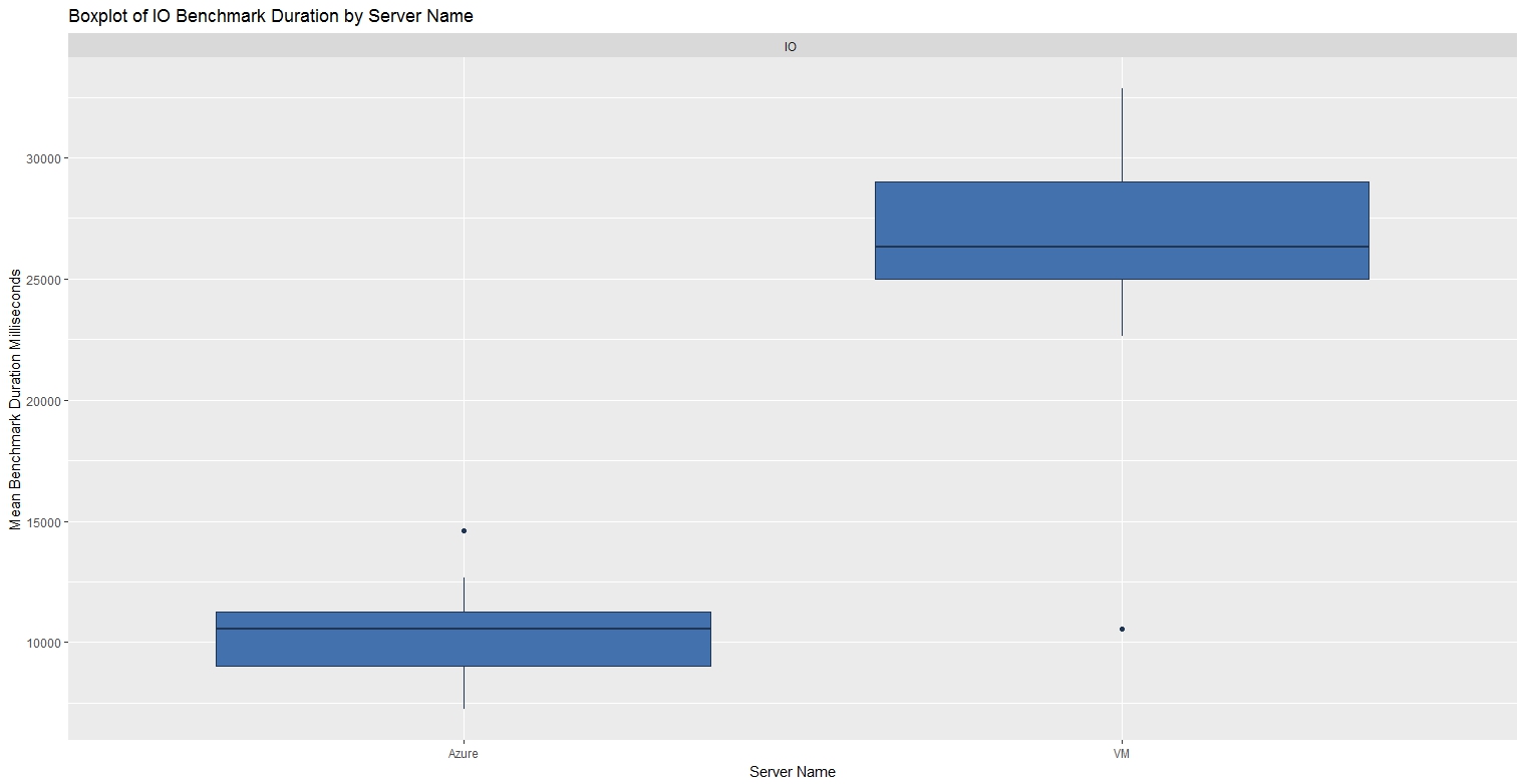 p2 <- p2 + ggtitle("Boxplot of IO Benchmark Duration by Server Name")