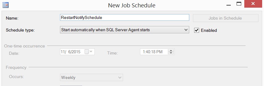 Here is where the “magic” happens in that you can set the schedule to only run when the Agent starts. With this schedule there is no need to run a job that polls data many times a day unnecessarily.