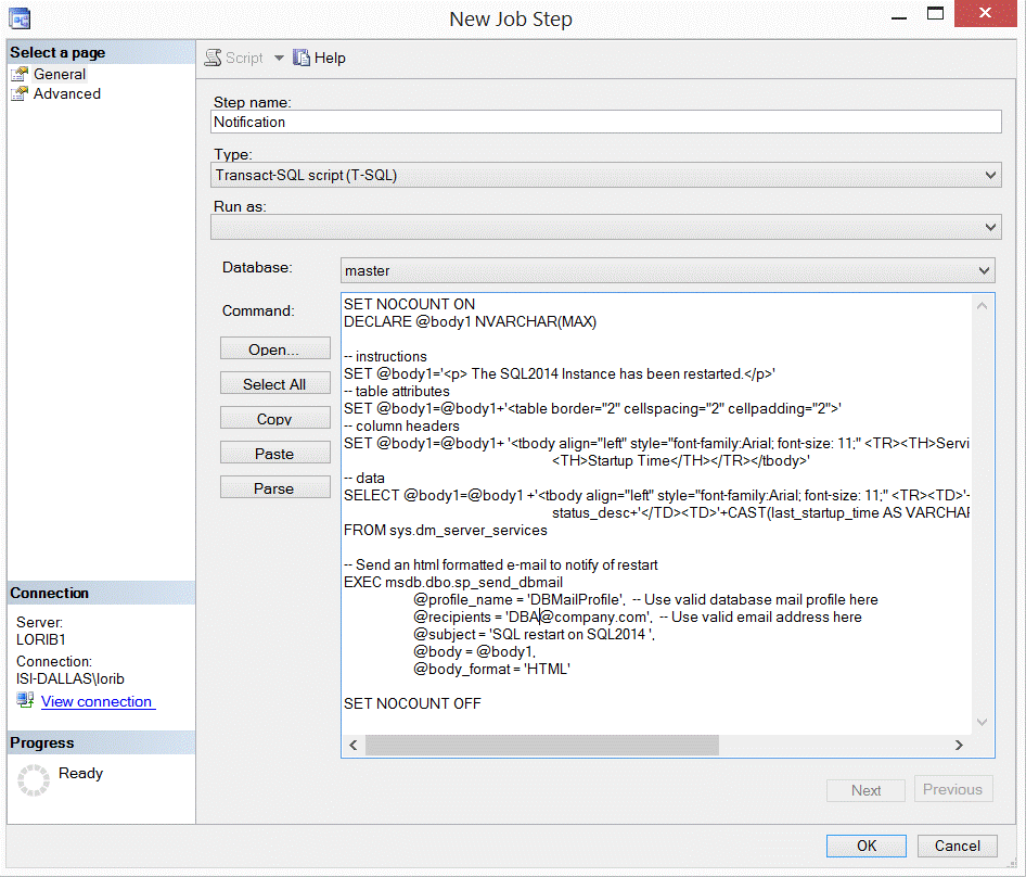 Add a job step with the code modified to have the correct instance name and a valid e-mail profile where needed.