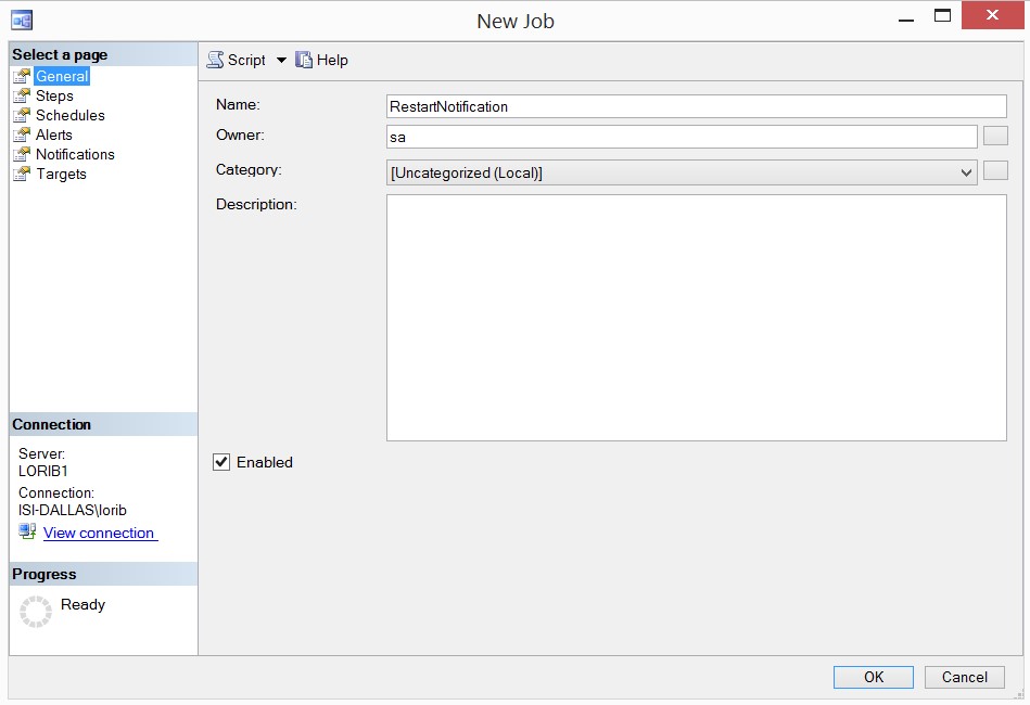 SET NOCOUNT OFFAnd finally here is the T-SQL of the actual job that I created for the cluster failover alert. It will only run if the SQLAgent is started since we have set the job schedule to only run at that time.