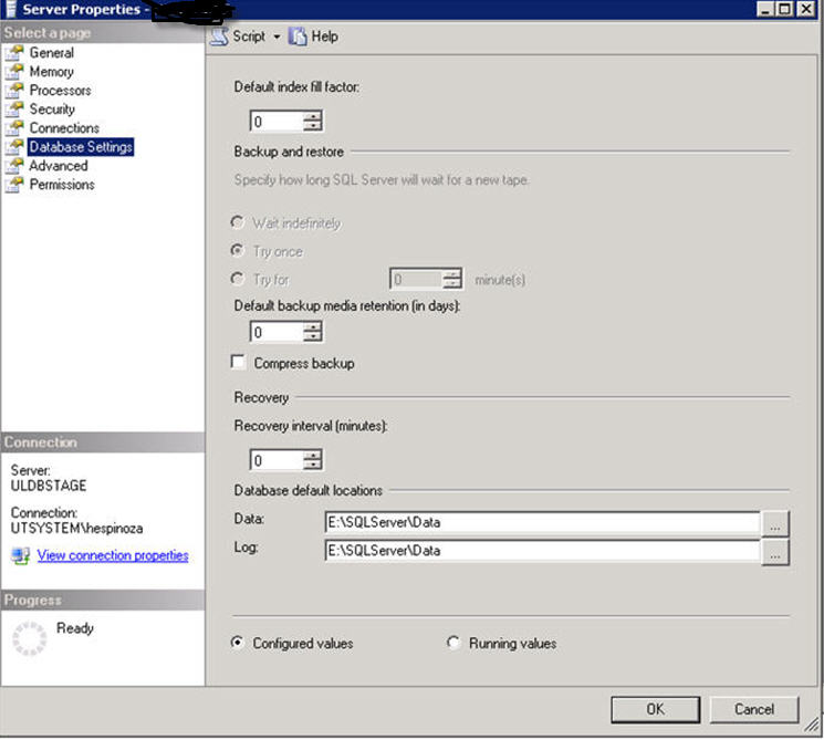 To make sure this issue didn’t occur again, I modified the database default directory to an existing directory. I logged into SSMS and right clicked on the instance name to get to the properties option. Under the “Database Setting” option, I changed the “Database default locations” data and log values (see Figure 2) and used “C:\Program Files\Microsoft SQL Server\MSSQL10_50.MSSQLSERVER\MSSQL\Data” as the default directory.