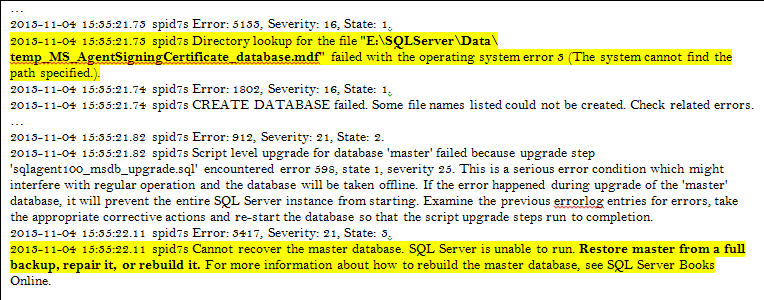 I read the lines at the bottom of the log file (Figure 1) and focused on the last line “Cannot recover the master database. SQL Server is unable to run. Restore master from a full backup, repair it, or rebuilt it. For more information about how to rebuild the master database, see SQL Server Books Online.” The message seemed to me that the master database was inaccessible or corrupted.