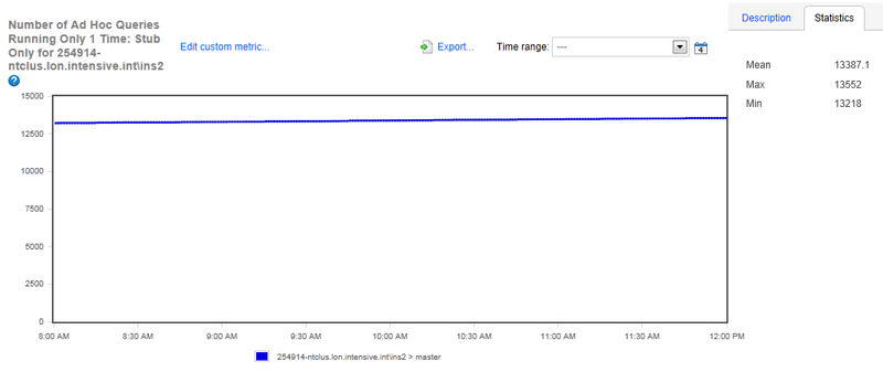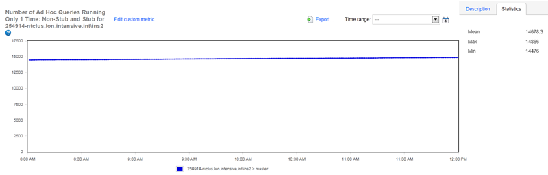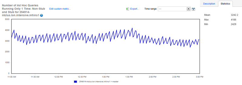 The first metric is one we have already seen. It counts the total number of one-time use ad hoc queries. I used the following code to create a custom metric in SQL Monitor so that the query was run every 60 seconds and the data stored so I could view it graphically for my benchmarking.
