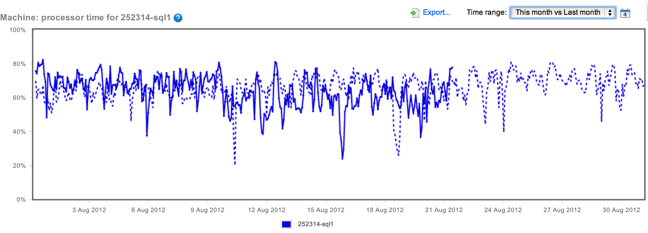 Whoa! OK. We're not seeing an increasing CPU. In fact, the CPU is eerily maintaining very identical peaks and valleys (for the most part), showing that behavior of the CPU is consistent. Whether it's good or not remains to be seen. Just to finish this line of thought, I went ahead and compared this month to last month: