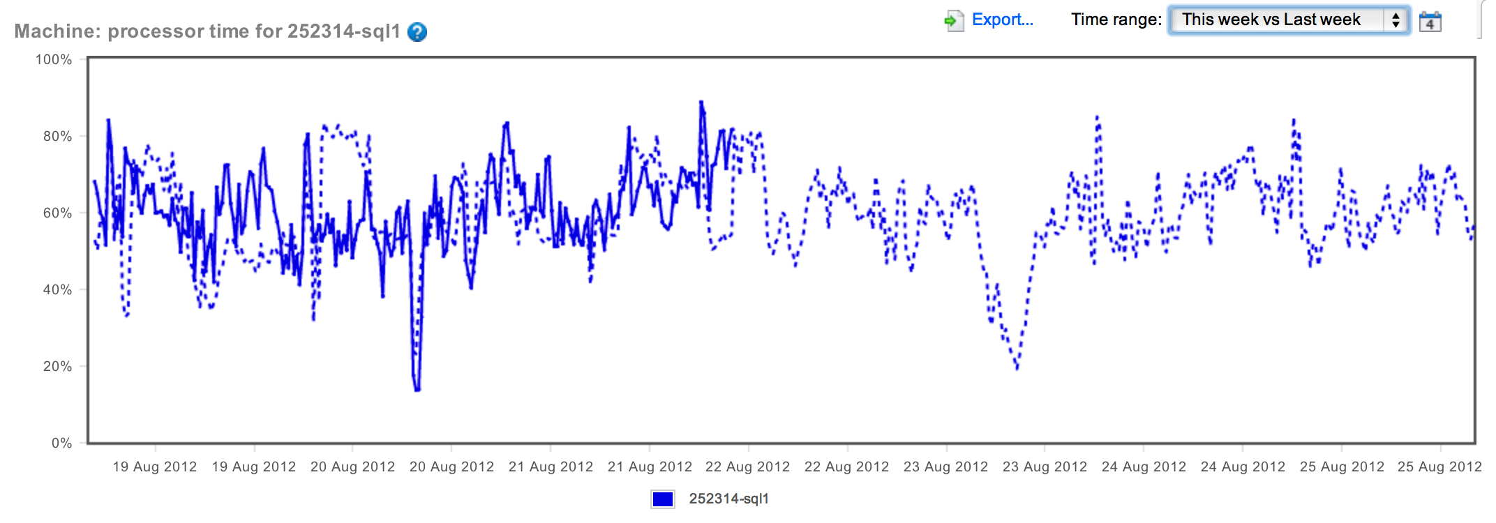 The difference between the two wasn't that great. In fact, if you look at it, you can spot similar peaks and valleys. But there did seem to be a slight increase in CPU over the last 24 hours. What we need is more information. How about comparing this week to last week: