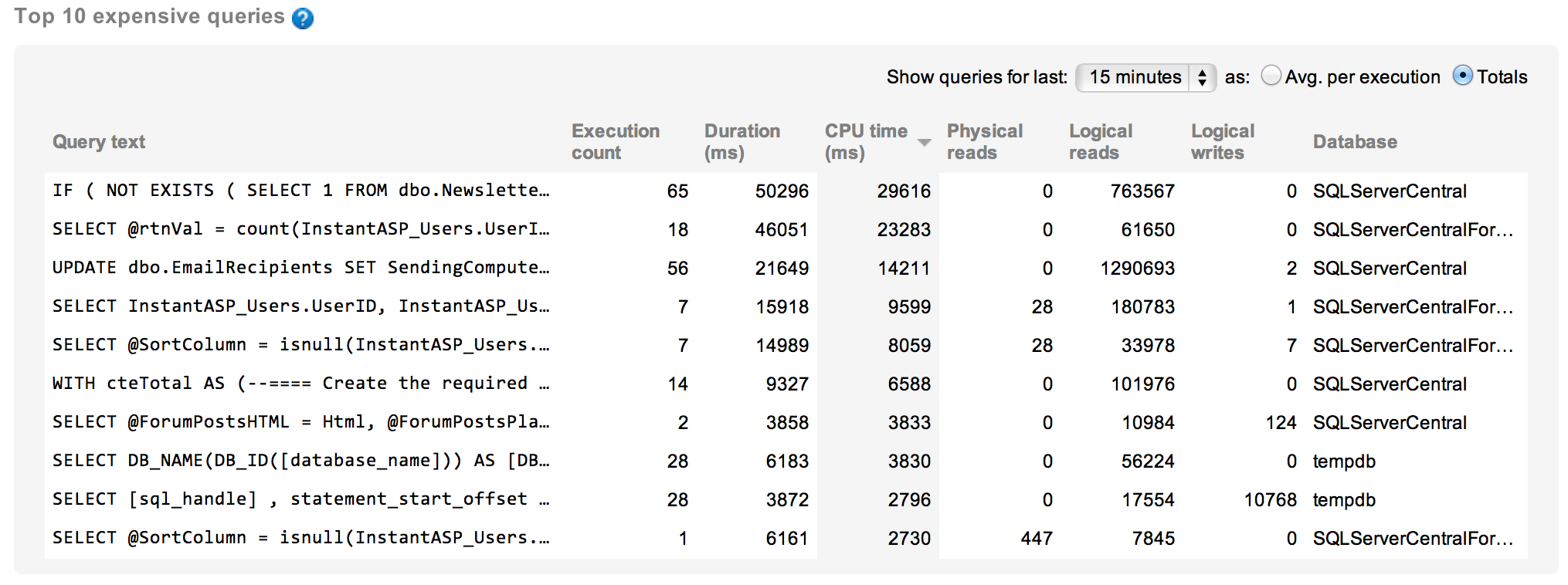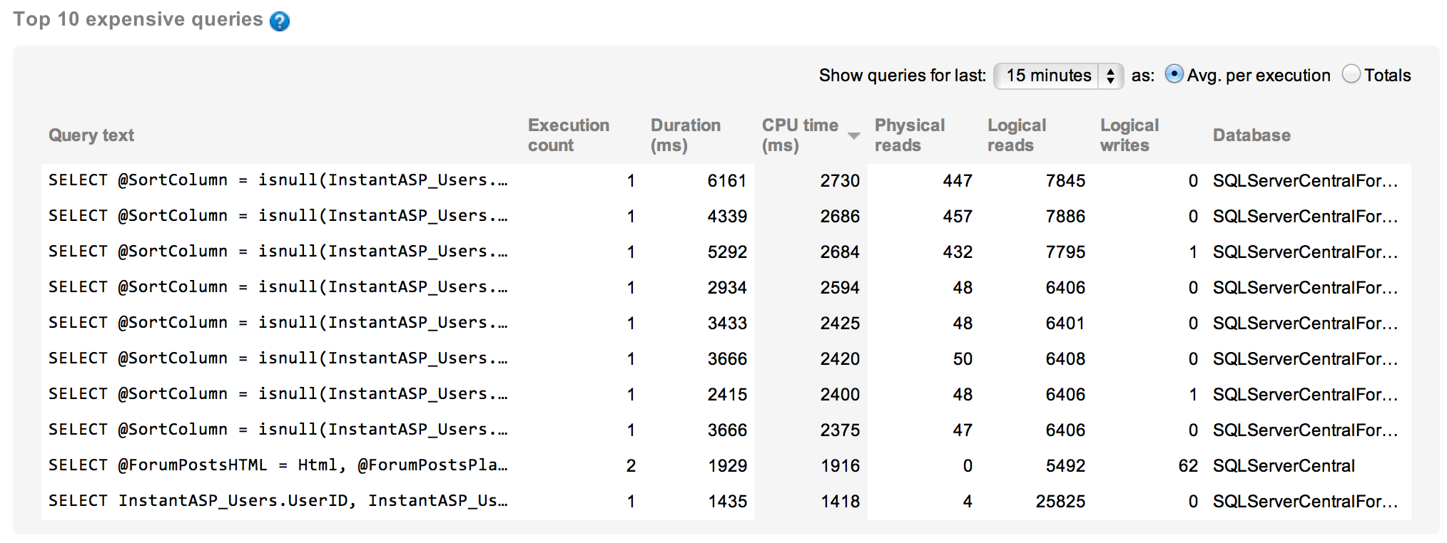 That leads me to take a look at the queries executing at that time. I can look at the queries from an individual basis and from an aggregate basis. This will allow me to spot individual calls from a query that is misbehaving or see when a query, in aggregate, is causing problems. First, the individual calls, ordered by CPU time: