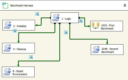 This simulates a more realistic set of benchmarks, with placeholders for creating and deleting test data, resetting the environment between benchmarks, and varying multiple benchmark parameters, including using a property expression on a key data flow property.