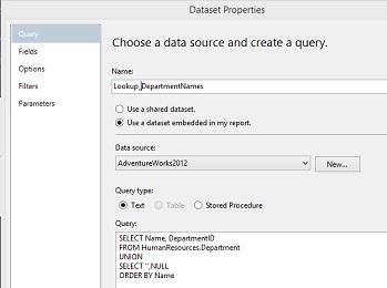 As a little exercise can you see what the difference would be if you modify the DepartmentNames dataset and remove the "SELECT '',NULL" portion of the query.