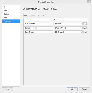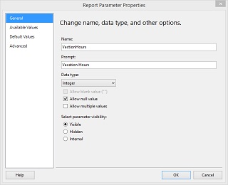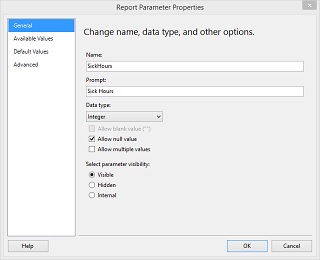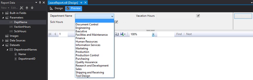 Based on the procedure we can see that we will need three parameters. The DepartmentID parameter in the procedure only accepts the ID value for a department. This is common and to make the report more user friendly for those that may not have memorized all the IDs we can provide them a textual view of the IDs instead, but have it pass in the integer value of the associated ID. The only other two parameters required will be for vacation hours and sick hours, these will have the user entering an integer value to be passed.