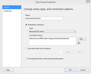 Before creating any datasets in a report you have to first create the data source. You can right click on "Data Sources" and select "Add Data Source...". Create the connection to your instance of SQL Server and the AW database following the screenshot below, it will default with Windows credentials: