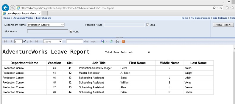 We now have all the parameters and datasets completed. Your next steps will be to design the body of your report, which is beyond the scope of this article. I simply added a page header with a title and a few text boxes so I could confirm how many rows were being returned. The body of the report is just a simple table that is tied to the Detail_LeaveReport dataset. If you deploy this to an SSRS instance you will see the end result that the user will be working with below: