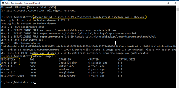 The image delivers the SSRS container and a complete set of databases, so each container (or instance) can operate independently and without resource contention. Images supporting conventional SQL Server instances use a similar dockerfile. Containers are created using >docker create <imagename>, and started by referencing the first few digits of the container ID, >docker start <containerid>.