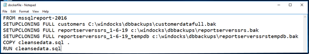 Container images are built using plain text dockerfiles. The example dockerfile uses the SQL Server 2016 SSRS image. Source databases, Report Server and Tempdb backups are included with separate lines with paths to their location. T-SQL and PowerShell scripts can be included to address database or instance configuration.