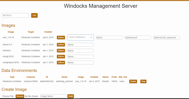 While the SSRS scale out operation would normally be automated, a web UI simplifies management and creation of images and containers. The image below shows the available images along with the current containers. A visual tool is also included for the selection of dockerfiles for image building. Access to the web UI includes user/group level authentication.