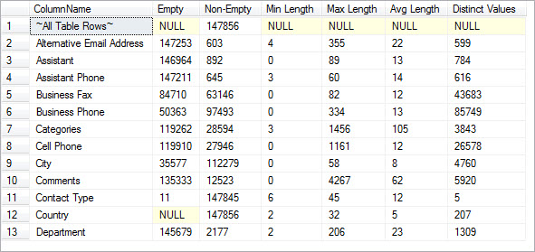 The “Min Length”, “Max Length” and “Avg Length” provide helpful details in assessing how consistent column data is across all rows, and in identifying often important outliers. I would expect “Business Phone” data (Row 6) to be fairly consistent, and the average suggests it is, for a collection of predominately North American phone numbers. However, the “Max Length” for that row shows at least one serious outlier at 334 characters, which could indicate an import problem. In this case, we determined that the legacy system employed almost no data entry controls or limits, and many users had simply entered extraneous data into this field.