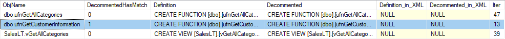 You should be able to inspect the Definition and Decommented columns to observe that the query effectively strips comments from the original Definition and returns the decommented T-SQL in the Decommented column. If you didn't want to see the objects that had CustomerID only in the comments, you could set the @DecommentedOnly variable at the top to 1 and the query would filter out those rows.