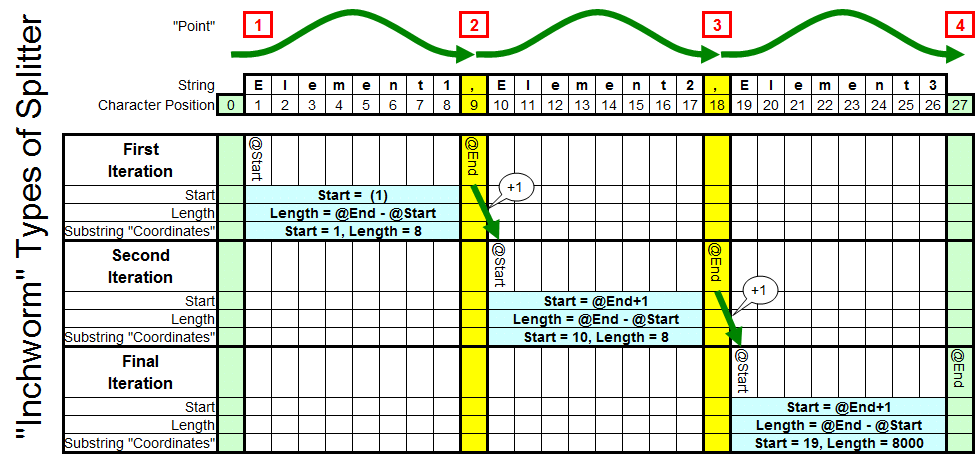 Obviously, the "Inchworm" While loop splitter I used in testing follows the above steps. What you may not realize is that the Recursive CTE (rCTE) method and the XML method (also included in the attached code) are nothing more than minor variations of the same theme. The rCTE uses a special formula (lordy, how I wish that I'd looked at that formula more closely earlier in the game) to handle the final element. The XML method, which is also an "Inchworm" type of splitter, first replaces existing delimiters and adds two "wrapper" delimiters around the original string with short "XML Tag" markers (to form Points 1 through 4 in the inchworm chart above) . Once the proper delimiters are in place, the XML splitter uses FOR XML to do the split based on those tag markers.