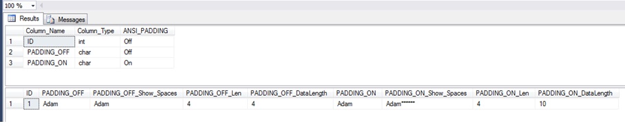 We can see from the second set of results that ANSI_PADDING is indeed off and our varchar column now doesn't retain the trailing spaces, as we expected.