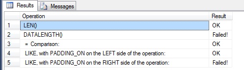 [dbo].[TEST_ANSI_PADDING]And of course, our outputs for our simple comaprisions are exactly what we’d expect: