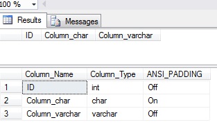 But what's this?! Our char column, despite having a fixed length of 10, no longer has trailing spaces either! Which begs the question: Can we alter an individual column's ANSI_PADDING flag after it's been created? Let's give it a try!