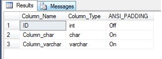 So even with no values in the table, once you turn ON ANSI_PADDING, you can’t turn it off. Note that this holds true for the varchar column as well.