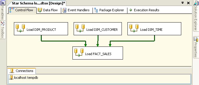- An OnSuccess precedence constraint to ensure that the fact table population occurs after the 3 dimension table populations because the fact table requires surrogate keys from those dimension tables.