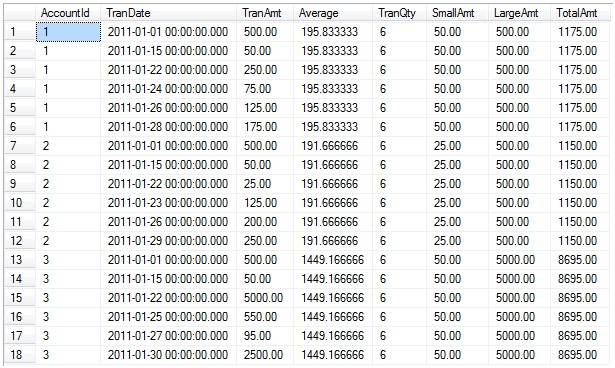 (3, '20110130', 2500);Let’s take a brief detour and look at what the previous versions of SQL could handle. If we consider just the rows for AccountId 1, we see that there are 6 rows. When we partition by AccountId, these 6 rows are the “window” for AccountId 1. The total of the TranAmt for these 6 rows is 1175, the smallest value is 50, the largest value is 500, and the average is 195.83. When we utilize the OVER clause with the AVG, COUNT, MIN, MAX and SUM functions, and if we specify to PARTITION BY AccountId, then we are specifying that for each AccountId we will be perform that functions’ aggregation for the window (for the rows for that AccountId). This aggregation is then repeated for each AccountId. In essence, a series of aggregations are being performed, once for each partition (AccountId).