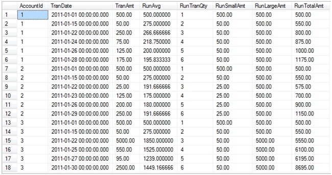 SELECT AccountId , TranDate , TranAmt, -- running average of all transactions RunAvg = AVG(TranAmt) OVER (PARTITION BY AccountId ORDER BY TranDate), -- running total # of transactions RunTranQty = COUNT(*) OVER (PARTITION BY AccountId ORDER BY TranDate), -- smallest of the transactions so far RunSmallAmt = MIN(TranAmt) OVER (PARTITION BY AccountId ORDER BY TranDate), -- largest of the transactions so far RunLargeAmt = MAX(TranAmt) OVER (PARTITION BY AccountId ORDER BY TranDate), -- running total of all transactions RunTotalAmt = SUM(TranAmt) OVER (PARTITION BY AccountId ORDER BY TranDate) FROM @SampleData ORDER BY AccountId, TranDate;