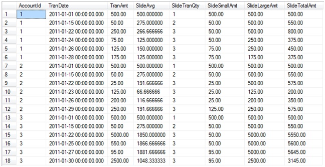 ORDER BY AccountId, TranDate;(Note that each of these “ROWS BETWEEN 2 PRECEDING AND CURRENT ROW” clauses could have been written as “ROWS 2 PRECEDING”, since CURRENT_ROW is the default ending point if not specified.)