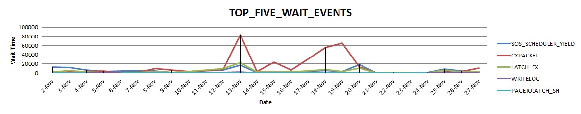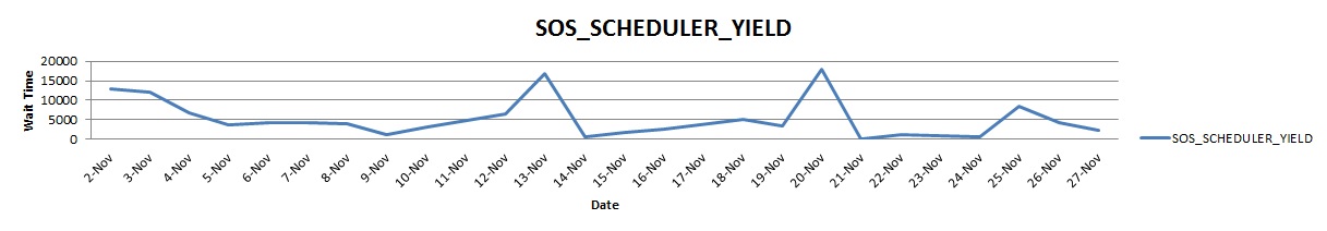 The graphs below show the pattern of CPU usage over the period. The compression was applied on the 21st of November and we see that except for spikes due to other operations, the pattern of key CPU related wait events is essentially the same. Actually a more accurate way to have checked this would be to create a User Defined Data Collector Set using Perfmon and specifically track counters in the Processor object.