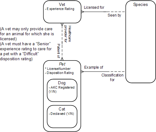 For this first installment, I would like to lay out the conceptual model including the business rules that apply for the problem space. The running example will be veterinary doctors and the pets they treat. We assume a requirements analysis has produced a valid conceptual (business) model that will be the basis for the implementation, introduced next.