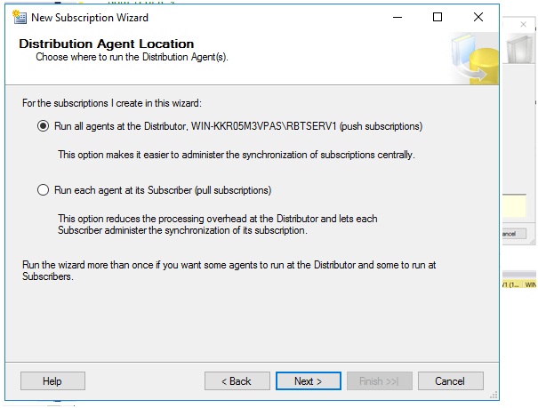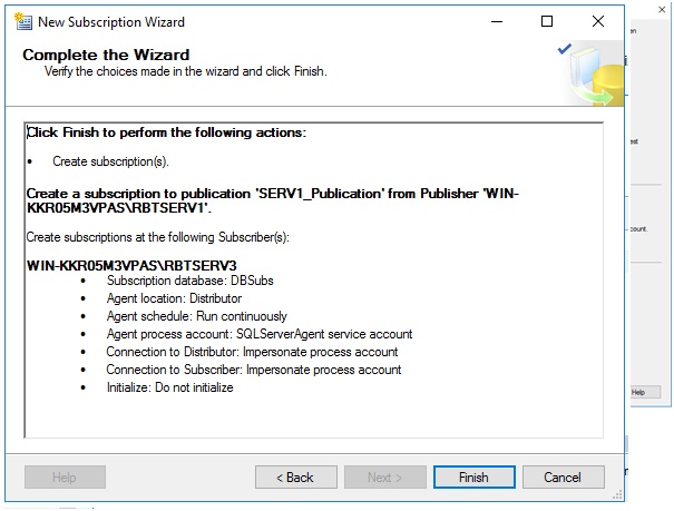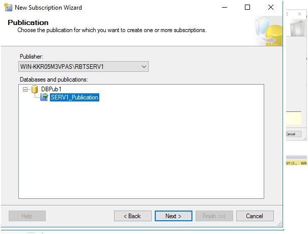 Once this is complete, right click on Publication SERV1_Publication and choose “New Subscriptions...”. In the Subscription wizard, choose your publication as SERV1_Publication