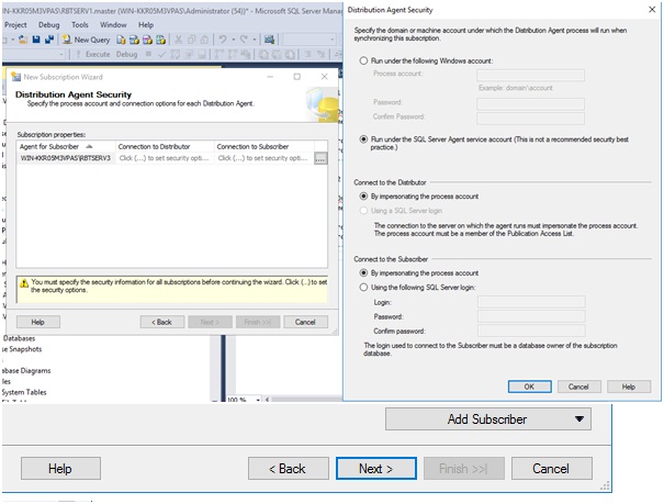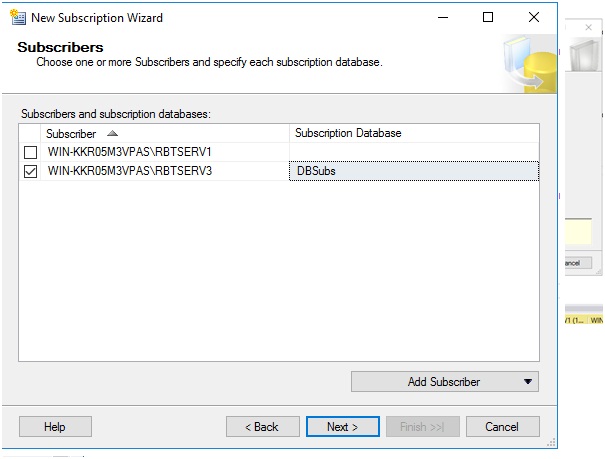 Now you select your subscriber server name and the subscription database. Here I have used RBTSERV3 as subscriber and DBSubs as subscriber database.