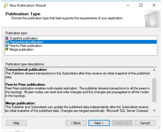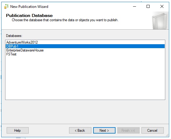In the publication wizard, select the database to be used for Publication. In our case, we are using DBPub1.