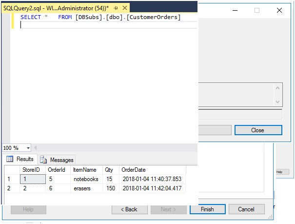SELECT * FROM [DBSubs].[dbo].[CustomerOrders]Now let’s add some new records to both servers. On RBTSERV1, run this: