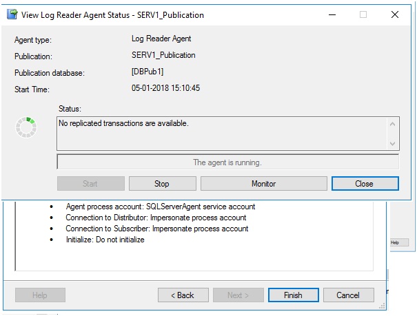 Now if you check the log reader agent status of RBTSERV1 or RBTSERV2, you should see it running fine.
