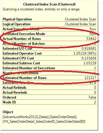 SQL Server creates statistics on each index about the distribution of values in each column. The query optimizer then uses this information when estimating the number of rows returned from an operation, and ultimately estimating the cost of using a particular index. As the data in a table changes, these statistics can get out of date. If the query optimizer uses bad statistics, it will calculate incorrect costs for its plans. You will see this discrepancy in an operation in an actual plan by comparing the estimated rows to the actual rows (see Figure 1). The difference in rows highlighted in Figure 1 was created by performing a delete operation on the table.