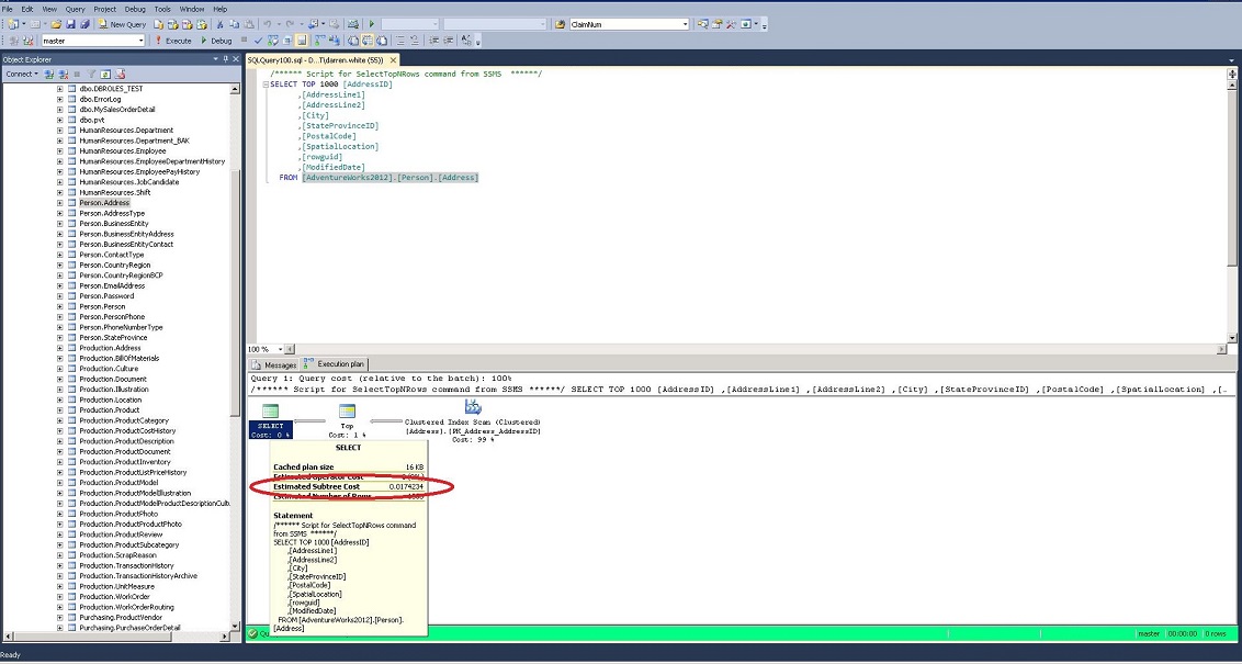 We are interested in the Estimated Subtree Cost. The total cost is a relative value that gives a better sense of whether the query will perform quickly or not. It is made up of I/O cost and the CPU cost. The Operator Cost is a sum of the I/O Cost and the CPU Cost. In this case our query has a cost of well under 1. It will probably execute relatively fast. On the other hand, a query with a total cost in the thousands will probably take quite a while to complete. Several factors affect the estimated cost. Not only the number of rows and indexes on the underlying tables and views, but also environmental factors such as the number of CPU’s and hard drive are used to calculate the costs.