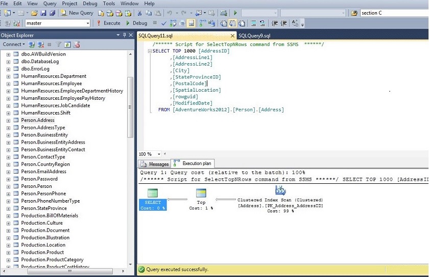 Figure 1 shows the estimated execution plan for a simpe select statent on the [AdventureWorks2012].[Person].[Address] table. As you can see, it is made up of icons that represent the operations and arrows that join the various operations. The arrows all point left, showing that the plans starts to the right and works left. To read the plan chronologically, start with the right-most operations and work left. Also, the relative thickness of the arrows is an indication of how much data is being passed from one operation to the next.