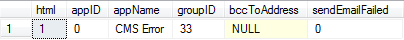 sendEmailFailedcolumn=1 )? the reason can be easily determined by looking at the column values of that record - notice the groupID column on tbl_SendEmail. We use that column to maintain the list of recipients for an email from "feedback forms" on our site (an in-depth description is for another writing). If an employee doesn't need to receive the feedback emails anymore their email address is simply removed from a table. No more storing lists of email addresses in config files.
