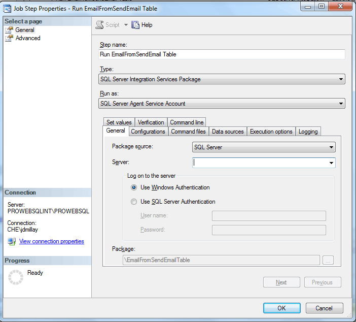 This is third and final part of the process. The job is set up via the server's SQL Server Agent node in Management Studio's Object Explorer. Figure 11 shows the setup of the job's one and only step. The step's package property (bottom of figure 11) is set to the name of the package (\EmailFromSendEmailTable). The "\" in that property indicates that the sql server the job is running on needs to look at its root level directory for the package. Be aware that the package does need to be deployed before setting up the job. Information on how to deploy a SSIS package can be found throughout SqlServerCentral's forums and writings (this article on deployment is very good).